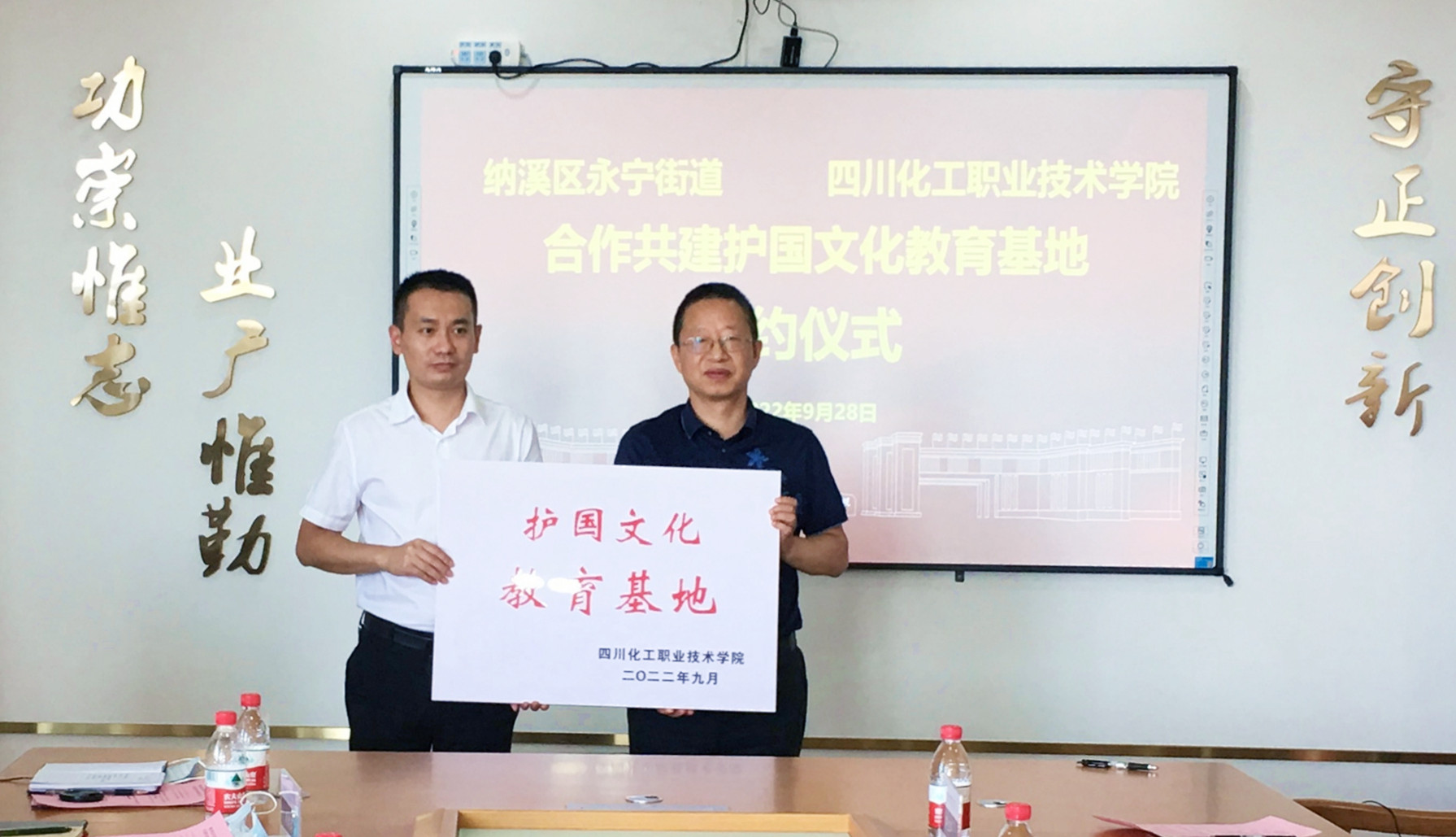 9月28日,学校与纳溪区永宁街道在综合办公楼206会议室举行合作共建“护国文化教育基地”签约仪式。纳溪区政协主席潘浩,区文旅局副局长唐霜,永宁街道党工委副书记、办事处主任周全,学校党委委员、副院长蒲开伦参加签约仪式。