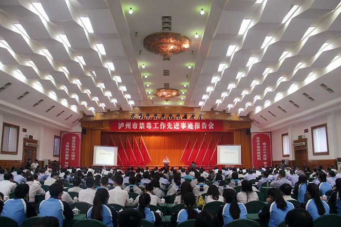 16日上午,泸州市禁毒工作先进事迹报告会在南苑会议中心举行,市人大常委会副主任伍福钊,副市长、市公安局局长封安,市检察院检察长罗乐出席报告会。学院文申柳副院长带领48名学生代表与全市政法系统、驻泸企业代表及中小学师生代表一道参加了报告会。报告会旨在集中宣传一批禁毒工作先进集体和个人的事迹,引导大家认真学习禁毒知识,树立全民禁毒、禁毒工作人人有责的理念。