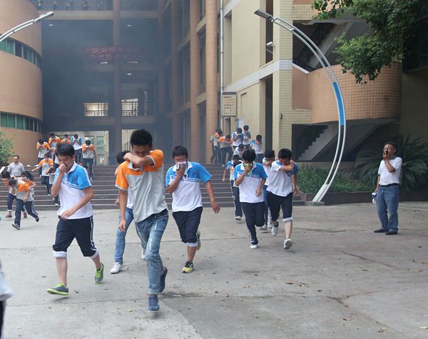 在军训教官、各系教师和保卫人员的指引下,2000余名新生用毛巾或衣物遮掩口鼻,按照“疏散指示标志”快速有序撤离到安全地带。经现场清点,发现还有6名学生未能及时逃脱被困“火场”,正通过挥舞衣物向外求救。
