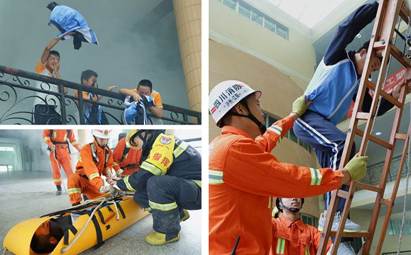 此时火势渐猛,不断蔓延,接警赶来的江阳区消防大队二中队消防官兵立即铺设水龙压制火势并开展救援,由于现场地形复杂,大型救援设备无法展开,消防官兵冲入“火场”利用担架绳降和伸缩梯及时救出被困学生。校医务室值班医护人员对受伤学生进行了简单救治,安排救护车迅速将“伤势较重”的人员送往就近医院抢救。