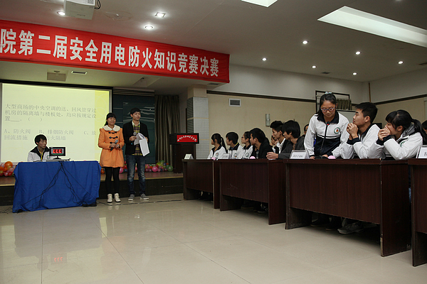 12月4日晚,四川化工职业技术学院第二届安全用电防火知识竞赛决赛在行政楼五楼会议室隆重举行。此次竞赛由学院保卫处、后勤服务与产业总公司、院团委、学生处主办,旨在加强我院学生安全教育和安全管理工作,使广大学生在丰富有趣的竞赛氛围中增强安全防范意识,提高应对紧急事故的能力,共同营造一个安全、和谐的“平安校园”。学院后勤服务与产业总公司王晓霞副总经理、廖寻真副总经理,经济管理系团总支张林园书记,保卫处姚继、李祖贵两位老师,学院宿管中心王雪梅老师、学生处江劲老师到现场观看了比赛。
