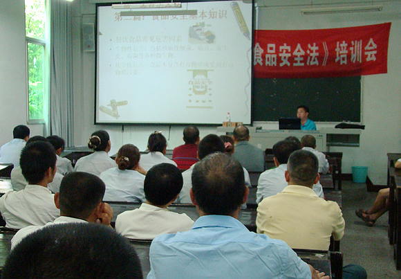 近日,“四川化工职业技术学院食品安全培训会” 在学院综合实训楼合班教室举行。市食品药品监督管理局食监科有关领导、学院后勤有关人员及学生食堂员工90余人参加了培训会。
