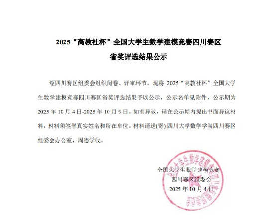 近日,2025年“高教社杯”全国大学生数学建模竞赛四川赛区成绩正式揭晓,学校基础部教师申富伟指导的贺煜垚、方锐、李雲淼团队荣获四川省赛区一等奖;苏洁老师指导的章勇、李星雨、潘维团队荣获四川省赛区三等奖,实现了学校在该项赛事中的新突破!