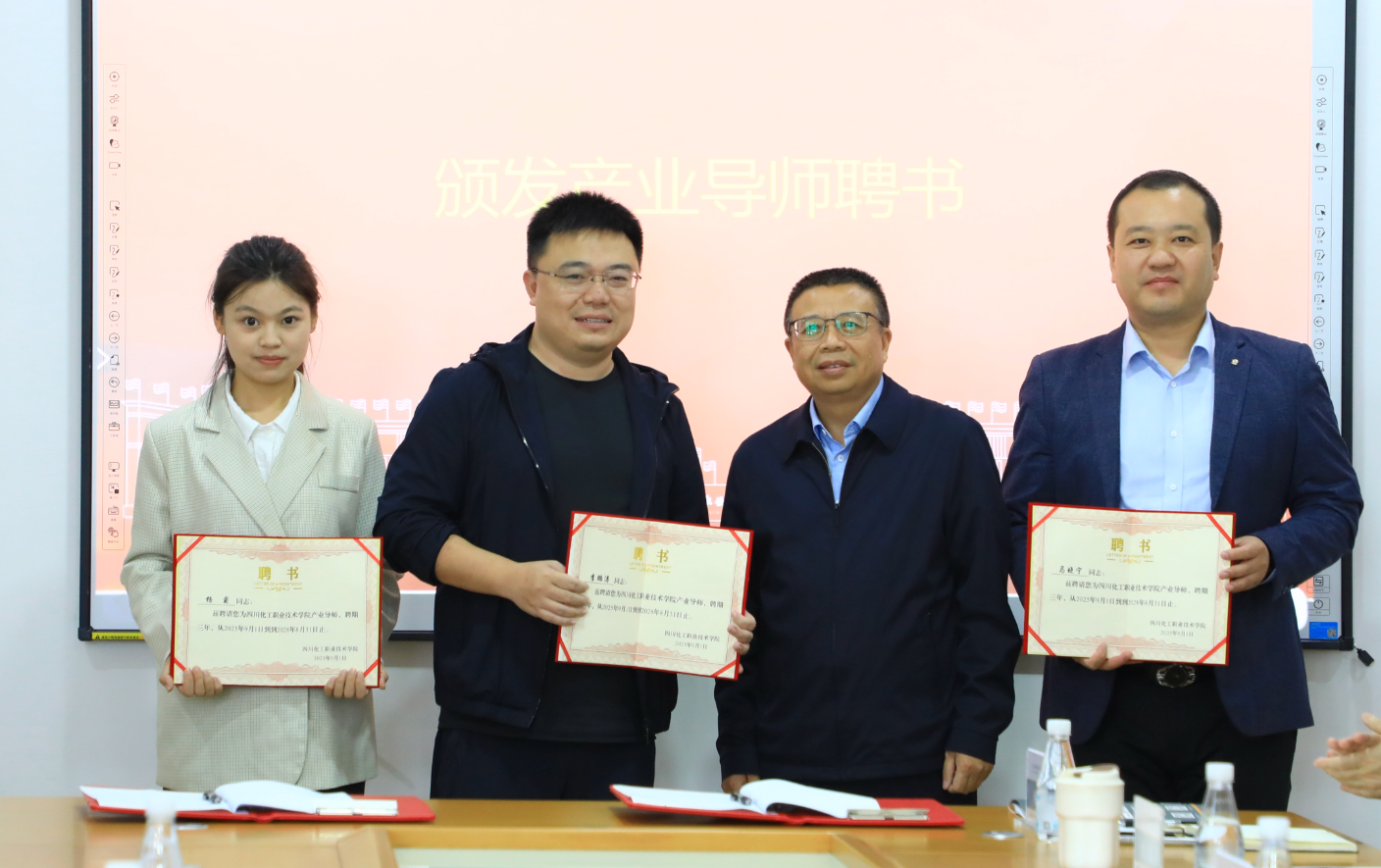 在与会人员的共同见证下,李鹏涛与徐丽萍共同签署了《泸州蜀台酒庄有限公司-四川化工职业技术学院校企战略合作框架协议》。邓启华为李鹏涛等颁发了产业导师聘书,旨在进一步加强校企合作,推动人才培养与产业需求的深度对接。