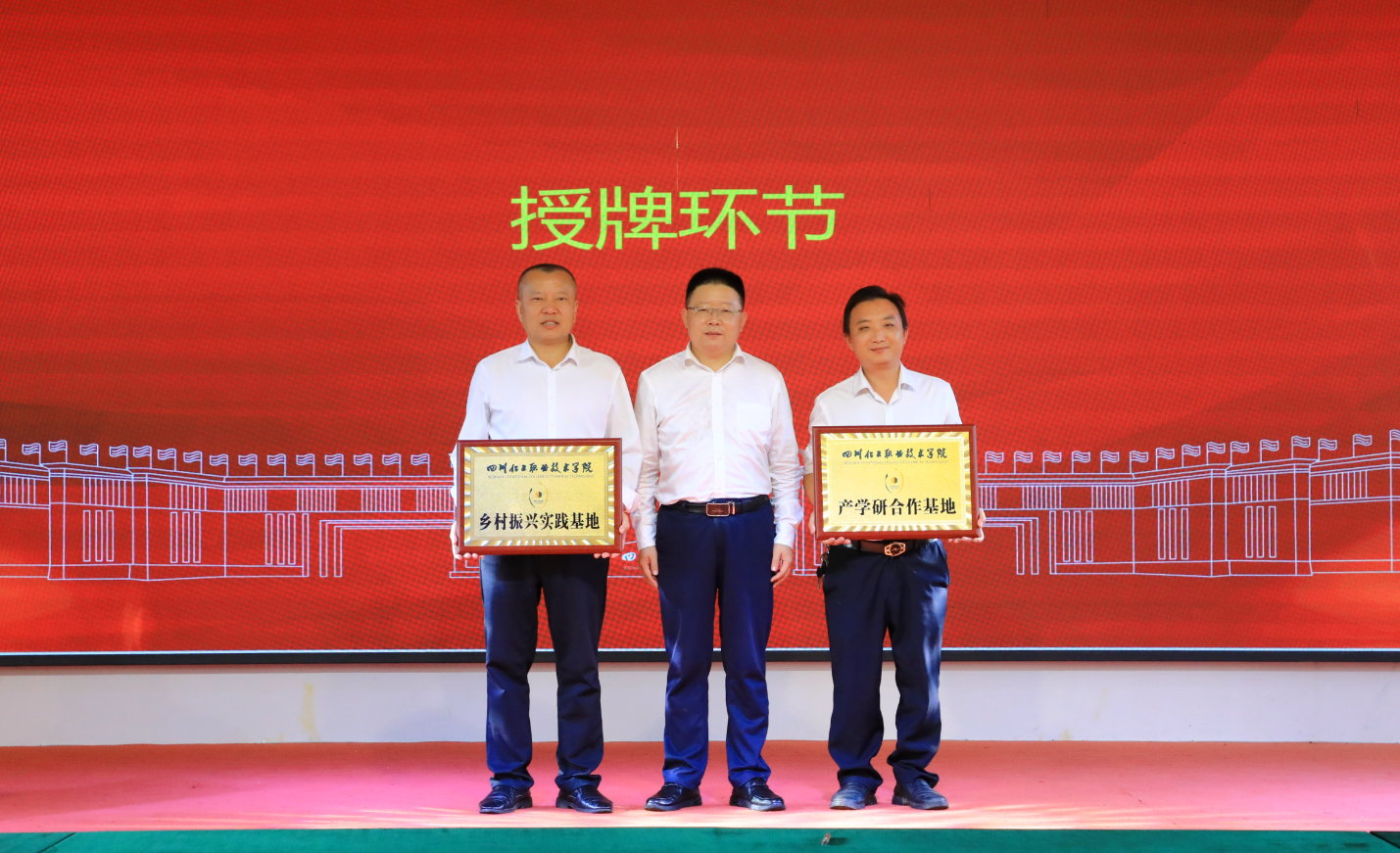 在与会人员的共同见证下,徐丽萍与李强共同签署了《纳溪区天仙镇双新村村民委员会•四川化工职业技术学院产学研合作协议》。文申柳向双新村和企业代表颁发了“乡村振兴实践基地”和“产学研合作基地”牌匾。
