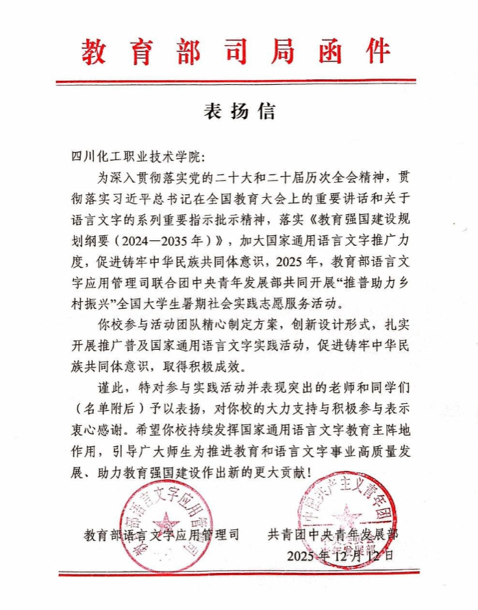 近日,教育部语言文字应用管理司与共青团中央青年发展部联合公布了2025年“推普助力乡村振兴”全国大学生暑期社会实践志愿服务活动优秀团队评选结果。学校应用化工学院“推普筑梦·多维振兴”志愿服务团凭借扎实的工作成效、创新的活动形式和富有影响力的实践成果,在全国2000余支团队中脱颖而出,荣获“优秀团队”称号,并获两部委通报表扬。这不仅是对学校实践育人成果的充分肯定,更是我校积极服务国家战略、履行社会责任、推动人才培养与社会发展深度融合的重要体现。