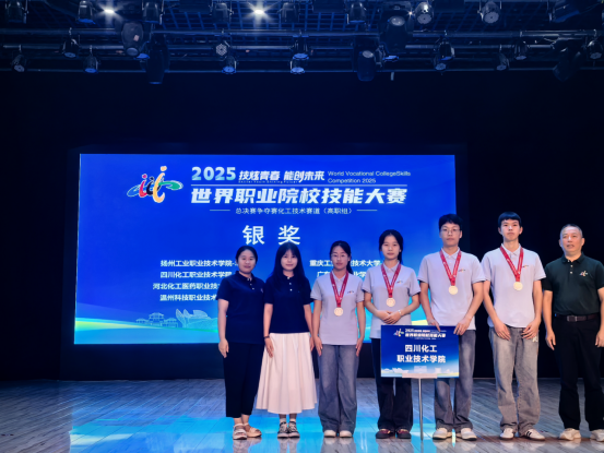 2025年8月26日至31日,由教育部等33家部委和单位联合主办的2025年世界职业院校技能大赛总决赛“化工技术”赛道高职2组比赛,在东营职业学院成功举办。来自全国24个省(市、自治区)的44支代表队同场比拼、切磋技艺。我校药品与环境工程学院任秋瑛、孟思宇、刘坤、付磊四位同学,在胡静、张华芳老师的指导下沉着应战、团结协作,最终荣获该赛道银奖。