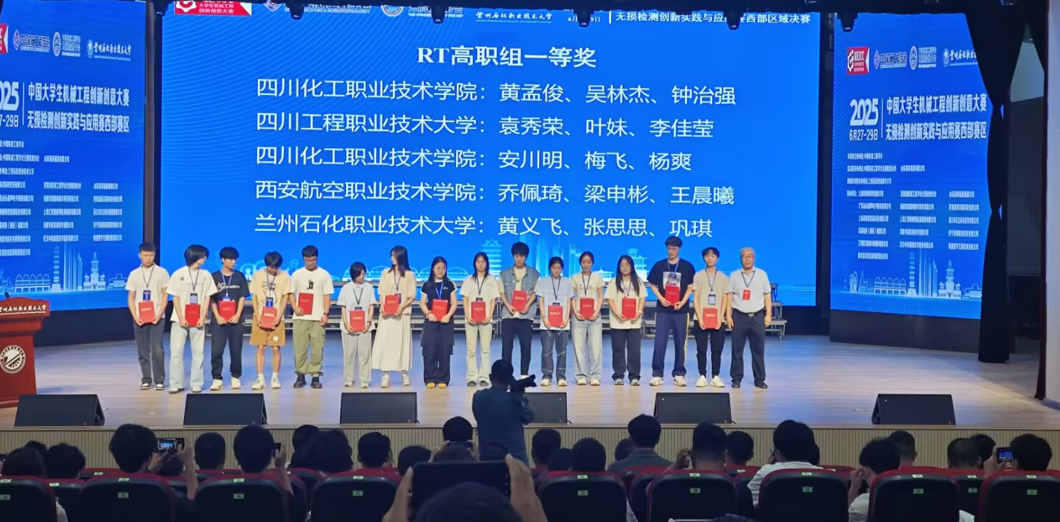 2025年6月27日至29日,由中国机械工程学会主办的2025年中国大学生机械工程创新创意大赛无损检测创新实践与应用赛西部区域赛决赛在兰州石化职业技术大学顺利举办。来自西部区域包括西南石油大学、四川工程职业技术大学等19所院校的76支参赛团队228名选手参加决赛。经过激烈角逐,学校由机械工程学院检测专业教师刘海、陈星红带队的4支队伍12名学生全部获奖并晋级全国总决赛,其中荣获“一等奖”2项、“二等奖”2项,其中一支获一等奖的队伍更是取得大赛第一名的好成绩,这也是学校学生连续2年斩获该赛项第一名,刷新了我校在无损检测创新实践与应用赛项的获奖数量记录,为学校争得了荣誉。