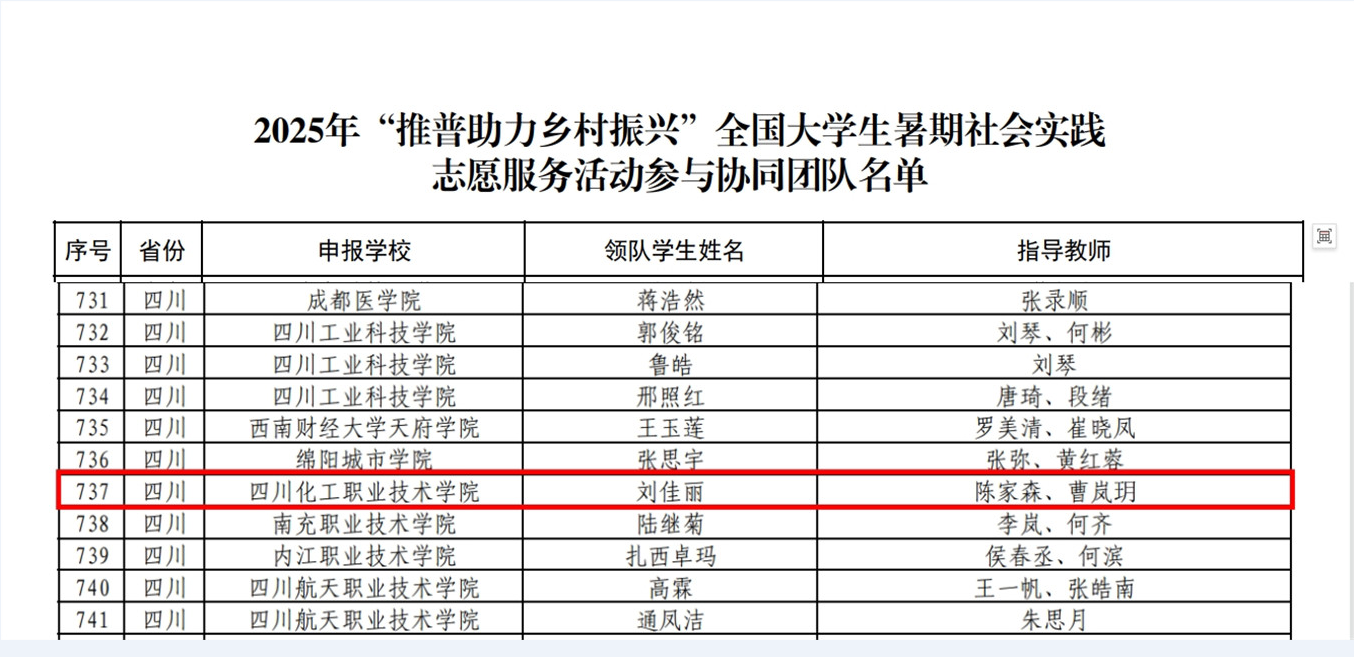 学校将以此次成功入选为新的起点,持续深化志愿服务工作,将进一步优化 “推普筑梦・多维振兴”实践活动方案,在暑期社会实践中扎实推进各项工作,确保活动取得实效。同时,学校将认真总结经验,积极探索志愿服务新模式、新途径,鼓励更多师生参与到志愿服务活动中来,打造具有化工特色的志愿服务品牌,以更加饱满的热情、更专业的服务,为乡村振兴和社会发展贡献更多的四川化院力量。