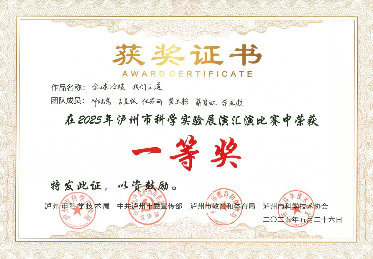 5月26日下午,由泸州市科学技术局、中共泸州市委宣传部、泸州市教育和体育局、泸州市科学技术协会共同主办的2025年泸州市科学实验展演汇演比赛决赛顺利举行。旨在弘扬科学精神、促进学校科学实验进步、提高科普教育水平。通过初赛、复赛的激烈比拼,共有来自全市大、中、小学校的15支参赛队伍进入决赛角逐。学校药品与环境工程学院孙银华老师、邓晓慧老师及川酒学院何静老师分别带领的师生团队参加比赛,并包揽了大赛前三名,全部获得一等奖。