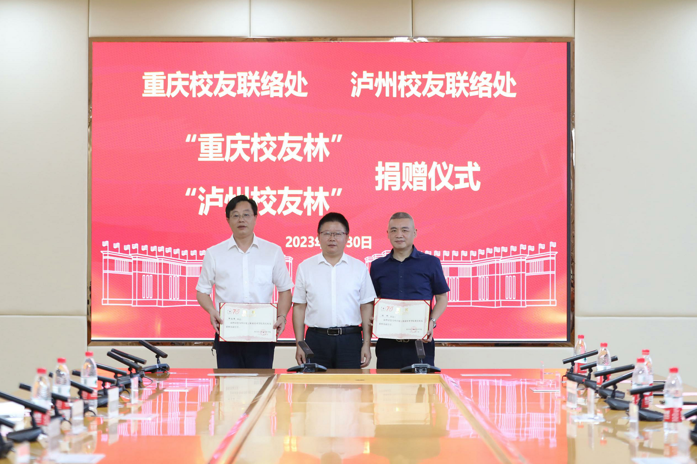 2023年6月30日上午,重庆校友联络处、泸州校友联络处“重庆校友林、泸州校友林”捐赠仪式在学校综合办公楼107会议室举行。重庆校友联络处主任、重庆宝润化工产品有限公司董事长石维胜,重庆校友联络处常务副主任、重庆鹰士达企业管理咨询有限公司董事长唐菠,重庆校友联络处副主任、重庆耀恒橡胶制品有限责任公司董事长邹志强,重庆校友联络处副主任、中国平安人寿保险股份有限公司重庆分公司资深业务总监杨柳,重庆联络处办公室副主任、重庆铭窑商贸有限公司总经理米平;泸州校友联络处主任、泸州斯特普有限公司总经理唐宁,泸州校友联络处副主任、泸州老窖酒城商贸股份有限公司总经理雷惠玲,泸州校友联络处副主任、四川麦田时光影视文化有限公司总经理黄祖华,泸州校友联络处副主任、四川美圆多企业管理服务有限公司总经理唐洪,学校党委副书记、院长文申柳,党委委员、副院长邓启华参加捐赠仪式。仪式由学校后勤服务处处长罗伦忠主持。