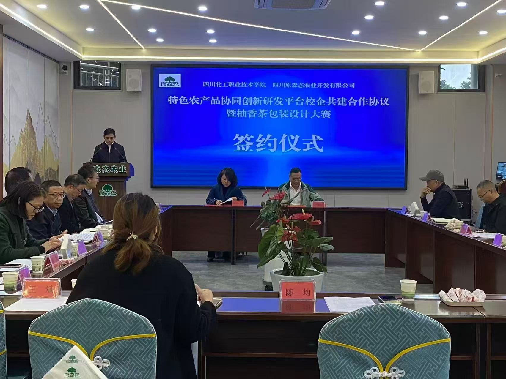 在与会人员的共同见证下,徐丽萍与陈均共同签署了《四川化工职业技术学院·四川原森态农业公司特色农产品协同创新研发平台校企共建合作协议》以及《四川化工职业技术学院·四川原森态农业公司联合举办柚香茶包装设计大赛协议》;邓启华为公司颁发了“乡村振兴实践基地”和“校企共建特色农产品协同创新研发平台”牌匾并向杨国权、陈均颁发了产业导师聘书。