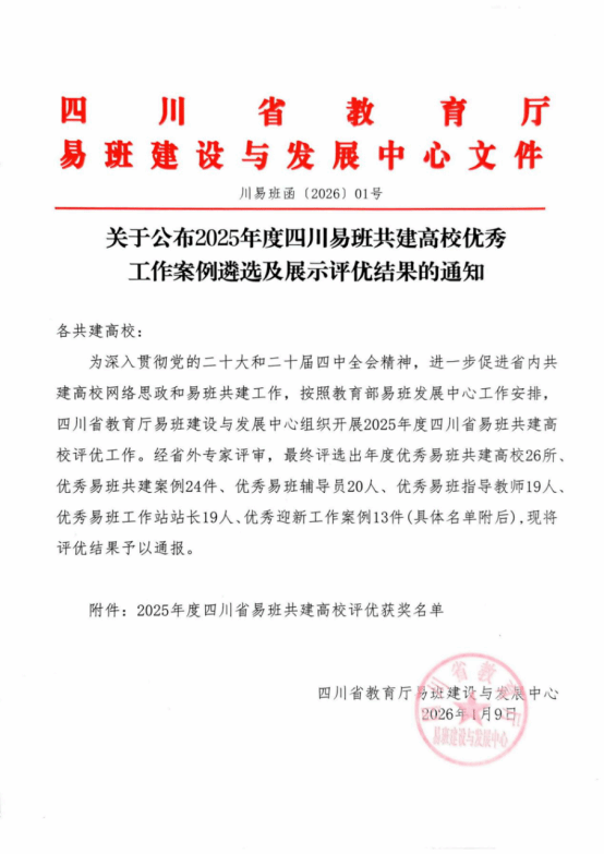 近日,2025年度四川易班共建高校优秀工作案例及展示评优结果正式公布。本次遴选及展示内容分为六个类别,每个高校推荐不超过四个类别。我校申报的四个类别全部获奖,荣获“优秀易班共建高校”“优秀易班共建案例”“优秀易班迎新案例”“优秀易班指导教师”四项省级荣誉,申报项目获奖率达100%。其中,我校《基于易班平台的“前置引导、精准服务、双线融合、价值引领”迎新工作模式》迎新案例,被推荐至全国参与评优。