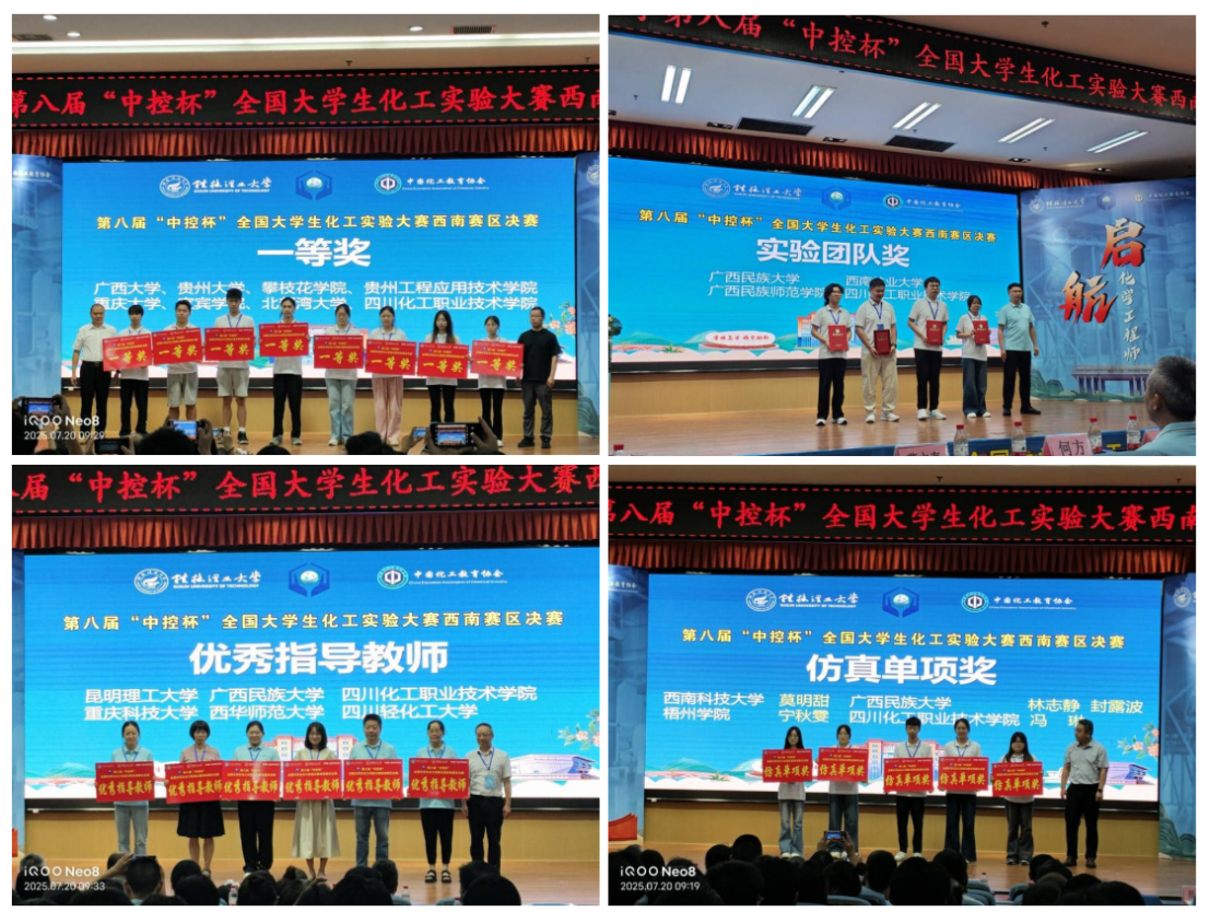 2025年7月20日,由中国化工教育协会主办的第八届“中控杯”全国大学生化工实验大赛西南赛区决赛在桂林理工大学落下帷幕。初赛于2025年6月22日以线上方式举办,吸引了四川大学、重庆大学、西南石油大学等61所高校的2000余支队伍、近6000名学生参与。经严格选拔,48支队伍晋级西南赛区决赛。我校应用化工学院舒荣禄、冯春荣、朱迎芝三位教师指导的由化学工程与工艺职教本科二年级学生董林、侯胜林、冯琳三名同学组成的学生团队,凭借扎实的专业知识和出色的团队协作能力,在比赛中表现卓越,荣获“西南赛区决赛一等奖”;该团队还荣获“实验团队奖”;三位指导教师分别获得“优秀指导教师”称号;同时,冯琳同学在化工原理仿真单项评比中脱颖而出,荣获“仿真单项奖”。