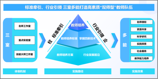 案例聚焦化工装备专业群“双师型”教师短缺、校企流动不畅、工程与科研能力薄弱等痛点,创新提出“标准牵引、行业引领、三室多能”建设路径。基于利益平衡理论,学院整合政府、行业、企业、学校四方资源,构建“名师工作室—技能大师工作室—重点实验室”三位一体协同机制,系统性培育教师“教学—工程—科研—服务—文化传承”多维能力。针对化工装备行业对复合型人才的迫切需求,学院首创“匠心双师”培育模式。通过引企入教、送教入企等方式,将行业经验转化为教学资源,显著提升教师教学设计、实施与反思能力。同步打造多元融合服务平台,围绕化工装备智能化转型需求,组建科研团队攻关数字孪生、智能制造等前沿技术,面向企业开展技术服务和专项培训,实现教师科研能力与社会服务能力双提升。