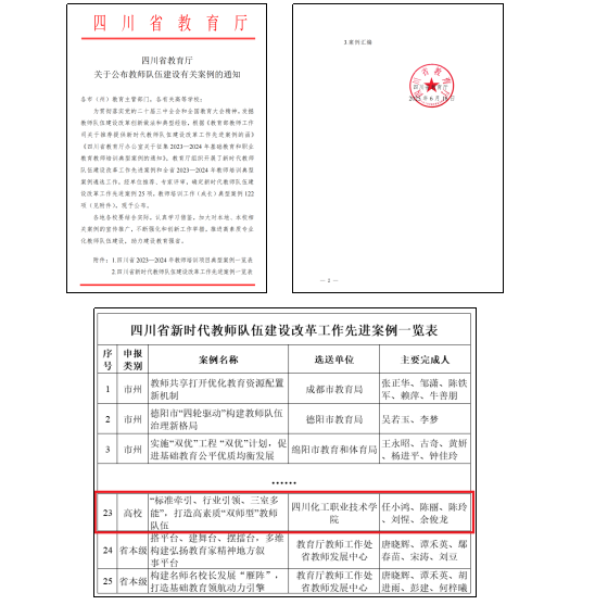 2025年6月16日,四川省教育厅正式公布教师队伍建设优秀案例名单。四川化工职业技术学院机械工程学院院长任小鸿领衔主撰,陈玲、余俊龙、陈丽、刘惺等教师共同参撰的案例《“标准牵引、行业引领、三室多能”,打造高素质“双师型”教师队伍》成功入选,标志着学院在深化职业教育教师队伍建设改革方面形成可推广的典型经验。