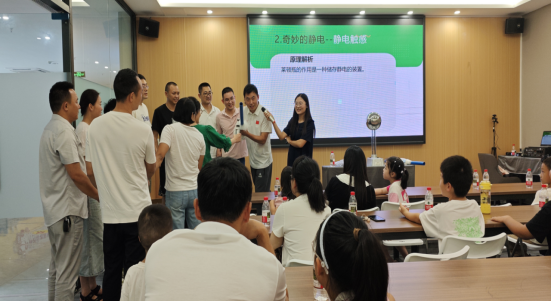 小朋友们在工作人员的指引下,转动手摇发电机,聆听发电机原理讲解;双手触碰范式起电机,体验静电带来的“怒发冲冠”现象;动手点亮磁悬浮灯泡,了解电磁感性式无线充电技术等,亲身体验电力的神奇与魅力。