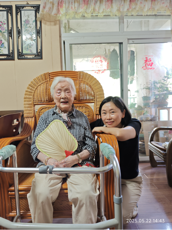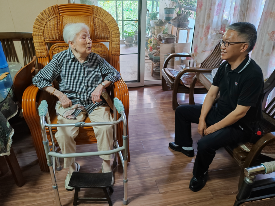 22日下午,慰问小组首先来到何练裳老人家中。见到久未谋面的“娘家”人,老人虽已年逾百岁,仍精神矍铄,拉着慰问组成员的手亲切交谈。周锦智代表学校向老人送上诚挚祝福,详细询问老人的饮食起居、健康状况和生活需求,叮嘱家属有困难及时向学校反映。何练裳老人连声道谢:“感谢学校这么多年的关心,我在这儿过得很好!”