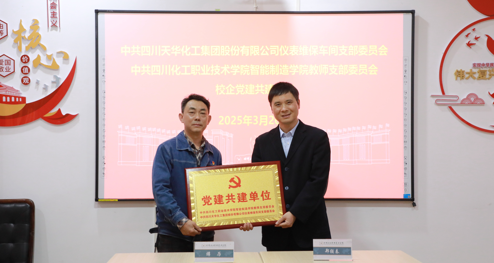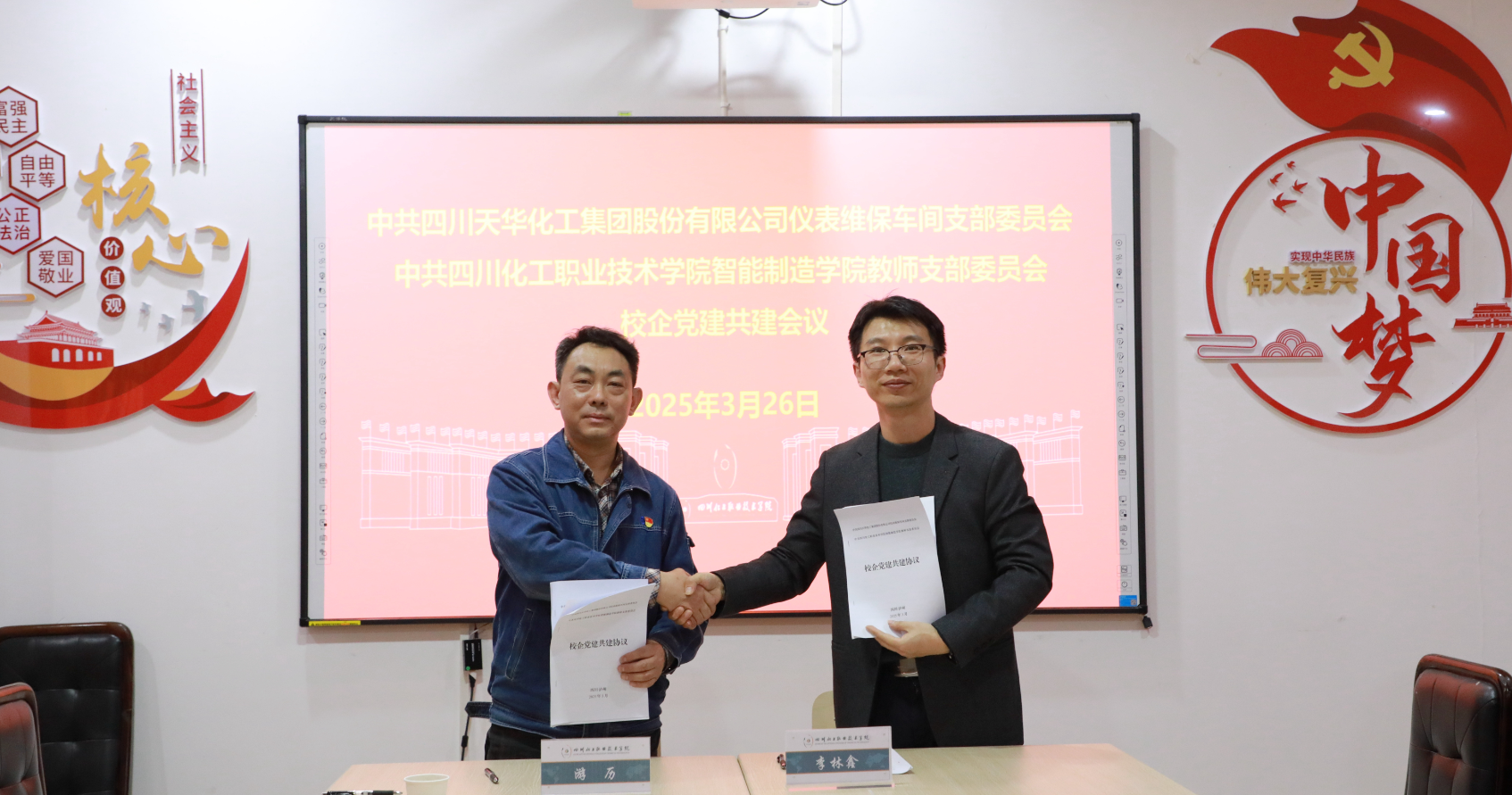 3月26日下午,中共四川天华化工集团股份有限公司仪表维保车间支部委员会与中共四川化工职业技术学院智能制造学院教师支部委员会校企党建共建会在护国校区综合办公楼241室举行。四川天华化工集团股份有限公司仪表维保车间党支部书记游历,学校党委副书记、纪委书记、工会主席郑辅春,智能制造学院党总支副书记、院长李林鑫参加会议。智能制造学院党总支副书记秦洪主持会议。