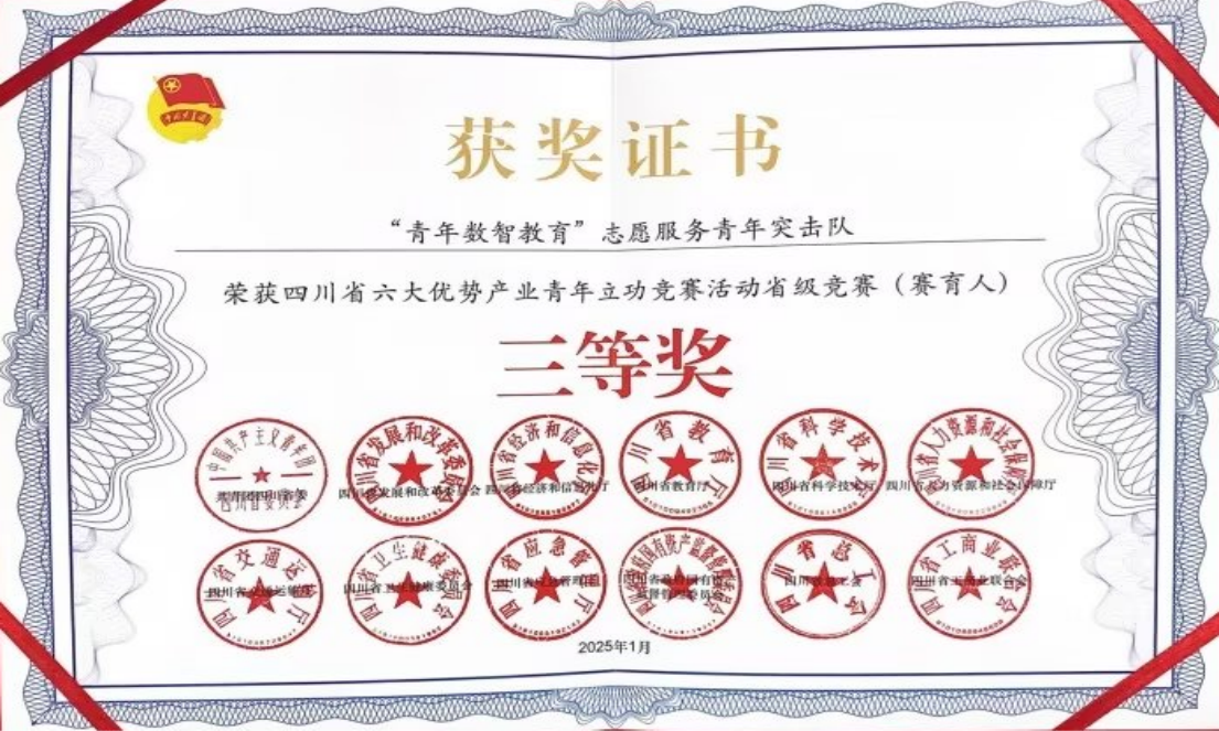 近日,由共青团四川省委等12部门联合举办四川省六大优势产业青年立功竞赛活动省级竞赛颁奖仪式在成都天府机场云享酒店金芙蓉宴会厅圆满落幕。此次大赛分赛创新、赛效率、赛质量、赛安全、赛育人五个赛项,来自全省共415支青年突击队入围省级竞赛初赛,100支青年突击队晋级决赛,数字经济学院“青年数智教育”志愿服务青年突击队在此次活动中荣获“赛育人”类别三等奖。