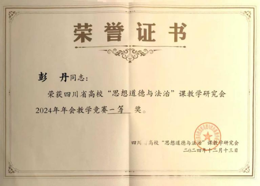 2024年12月12日—14日,由四川省教育厅指导,四川省高校“思想道德与法治”课教学研究会、全国高校思政课“手拉手”集体备课中心(四川大学-四川省)、李辽宁名师工作室主办的四川省高校“思想道德与法治”课程教学研究会2024年年会暨全省“手拉手”集体备课会在四川轻化工大学举行。学校马克思主义学院教师彭丹凭借扎实的理论功底、出彩的教学设计、精彩的现场讲授,从全省高职高专竞赛组脱颖而出,荣获教学竞赛“一等奖”的优异成绩。