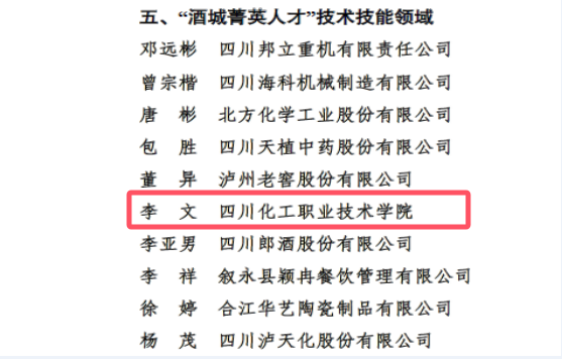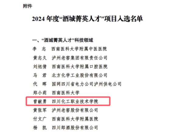 近日,为深入贯彻落实党的二十大精神和中央、省委关于人才工作的决策部署,泸州市积极实施新时代人才强市战略,加快建设区域创新人才聚集地。经过严格的申报、评审、考察和公示程序,2024年泸州市“酒城菁英人才”计划名单正式揭晓,共有80名优秀人才脱颖而出,其中,四川化工职业技术学院机械工程学院的曾献勇和李文两位教师荣耀入选。