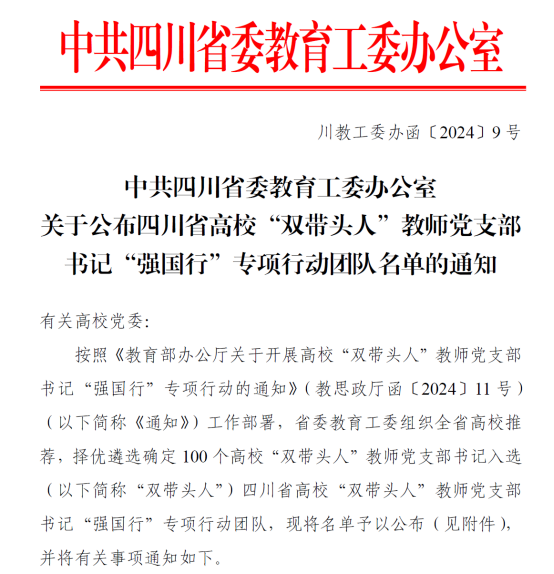 近日,四川省委教育工委公布了四川省高校“双带头人”教师党支部书记“强国行”专项行动团队名单,机械工程学院教师党支部成功入选四川省高校“双带头人”教师党支部书记“强国行”专项行动团队。