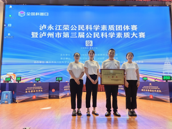 2024年9月20日,在科技处副处长文仁兴带队下,学校教师牟光元、胥霞、蒲建林、夏可代表四川化工职业技术学院参加“泸永江荣公民科学素质团体赛暨泸州市第三届公民科学素质大赛”。本次大赛共有14支队伍参加,我校代表队经过科普展演环节、必答题、抢答题、风险题四个比赛环节的激烈角逐下,荣获大赛二等奖。