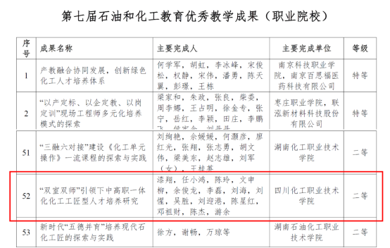 近日,中国化工教育协会发布了《关于第七届中国石油和化工教育教学成果认定结果的公示》(中化教协发〔2024〕52号),我院漆翔教师团队申报的教学成果“‘双室双师’引领下中高职一体化化工工匠型人才培养研究”荣获二等奖。这是我院继第六届中国石油和化工教育教学成果奖后再次获奖,充分展示了学院在化工职业教育领域的持续创新与成就,也彰显了我院在行业内的领先地位。