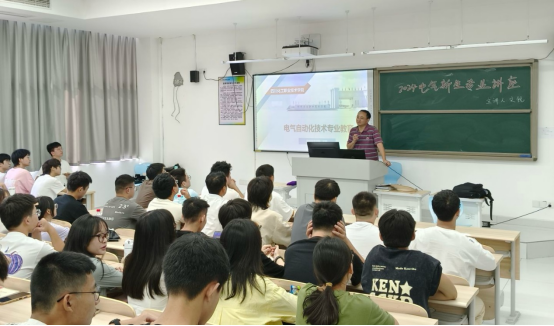文锐老师作为主讲,首先从电气自动化技术概述切入,向同学们介绍了该领域的发展背景及前景。接着,他介绍了专业培养目标,强调学院旨在培养理论扎实、实践能力强的高素质技术人才,特别是在智能制造、自动化设备维护与调试等方面具有优势。随后,文锐老师详细介绍了核心课程设置,包含电气控制与PLC技术、继电保护技术、传感器与检测技术等。他强调实践教学的重要性,学院配备了先进的实验设备,实践课程如“工厂供配电实训”让学生能够在真实环境中应用所学知识。同时,鼓励学生参与各类技能竞赛,并提供知名院校交流机会,帮助学生提升竞争力、拓宽视野。