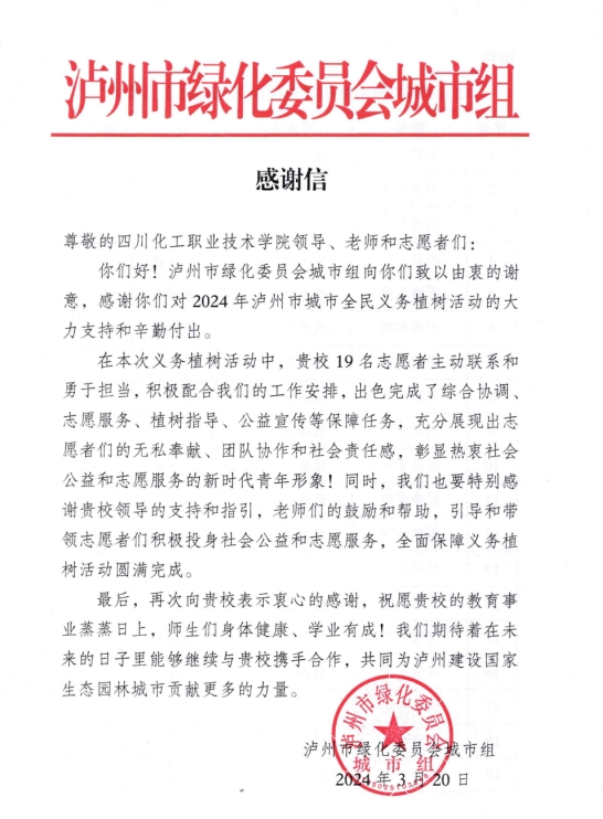 近日,泸州市绿化委员会城市组发来一份感谢信,信中对四川化工职业技术学院川酒学院19名志愿者在“相约春天,为国家生态园林城市充‘植’”活动中的志愿服务表现做出高度赞扬。