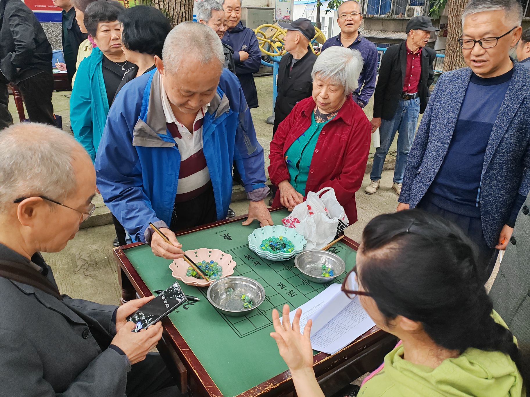 运动会现场,气氛热烈。比赛项目丰富多样,包括丢小球、飞镖、夹珠子、丢沙包、翻扑克、保龄球、丢乒乓和翻麻将等8个项目。每一项都充满了趣味和挑战,吸引了众多老同志的积极参与。