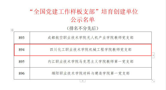 3月18日,教育部思想政治工作司公示了第四批新时代高校党建示范创建和质量创优工作遴选结果。其中,四川化工职业技术学院机械工程学院教师党支部获批“全国党建工作样板支部”培育创建单位,实现了学院党建工作成果的国家级突破。