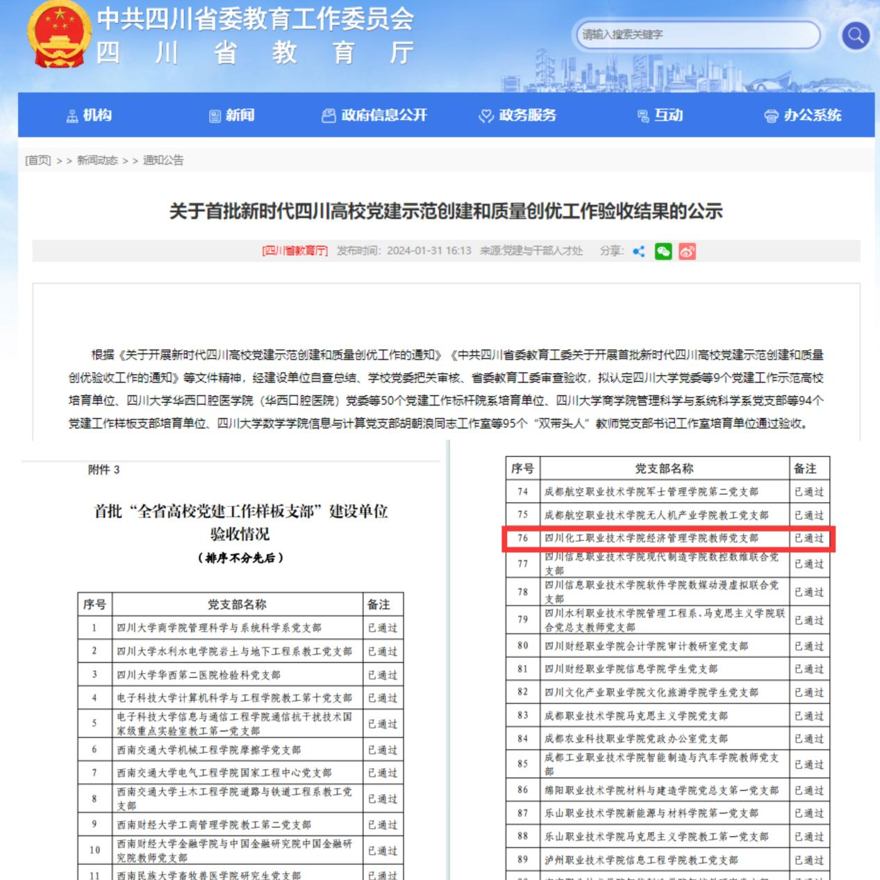 近日,四川省委教育工委公布了《关于首批新时代四川高校党建示范创建和质量创优工作验收结果的公示》,四川化工职业技术学院经济管理学院教师党支部顺利通过四川省首批“全省高校党建工作样板支部”建设单位验收。