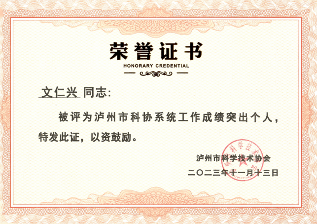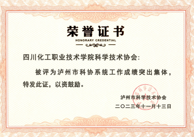 2024年3月5日,泸州市科学技术协会颁发泸州市科协系统工作成绩突出集体和个人证书,我校科协荣获泸州市科协系统工作成绩突出集体,学校文仁兴老师荣获泸州市科协系统工作成绩突出个人。