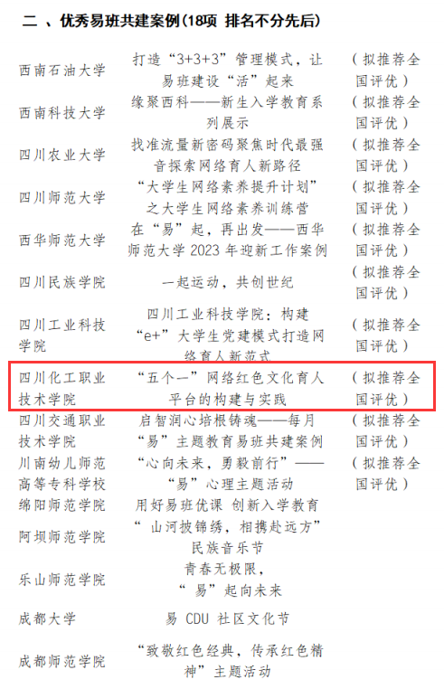 2月29日,省教育厅易班建设与发展中心公布2023年度四川省易班共建高校评优获奖名单,我校被评为“优秀易班共建高校”,这也是学校连续七年获此殊荣;学校报送的《“五个一”网络红色文化育人平台的构建与实践》被评为优秀易班共建案例(拟推荐全国评优),学生处陈善娜老师被评为“优秀易班指导教师”(拟推荐全国评优),应用化工学院精细化工2131班邓丽萍同学被评为“优秀易班工作站站长”(拟推荐全国评优)。这是自2015年开展易班共建高校优秀工作案例遴选及展示工作以来,学校连续7次被评选为“四川省优秀易班共建高校”。