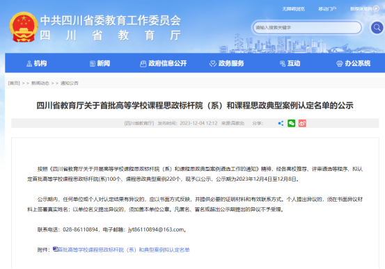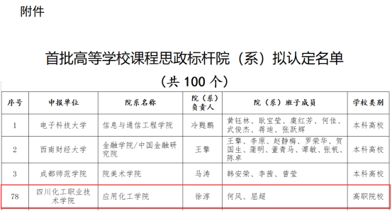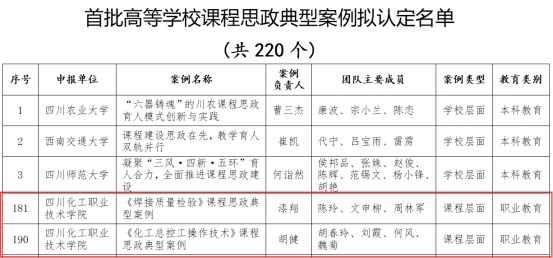 近日,四川省教育厅公示了高等学校课程思政标杆院(系)和课程思政典型案例遴选结果,学校应用化工学院被认定为课程思政标杆院系,《焊接质量检验》《化工总控工操作技术》被认定为课程思政典型案例。