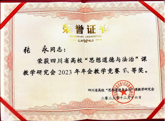 12月16日,由四川省高校“思想道德与法治”课教学研究会举办的2023年度四川省高校“思想道德与法治”课教学竞赛在四川建筑职业技术学院举行,我校马克思主义学院张永老师凭借扎实的功底、良好的气质、稳定的发挥从全省高校所有选手中脱颖而出,取得全省“二等奖”的优异成绩。