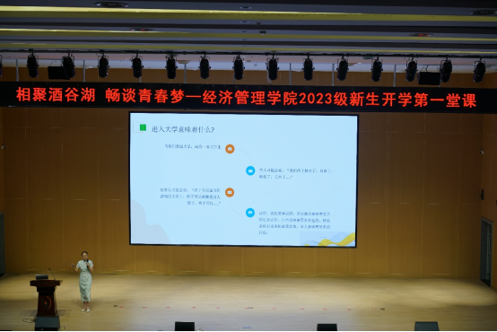 为让23级新同学更好的适应大学学习生活,营造良好的学习氛围,树立长远的奋斗目标,经济管理学院于9月20日,9月21日为23级新生开展了两场“相聚酒谷湖,畅谈青春梦”新生开学第一堂课活动,经济管理学院党总支书记张晋教授、副院长陈秀芬教授分别与全院700余名新生展开交流。