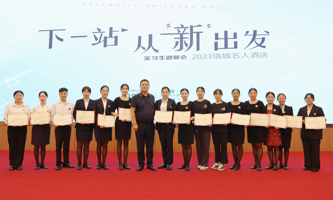 首先,成都瑞城名人酒店总经理庄文金发表致辞,肯定了酒店与学院合作共建中国特色学徒制的成果,表达了对2021级实习生的热烈欢迎,并祝愿每位实习生在接下来的实习生涯中拓展眼界、丰富知识、提升技能。