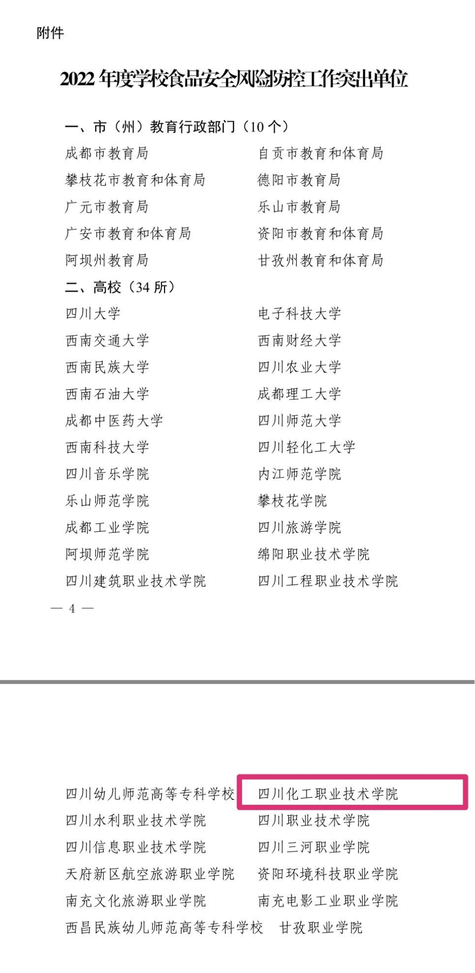 近日,省教育厅印发了《关于2022年度学校食品安全风险防控评议结果的通报》,教育厅组织对21个市(州)教育主管部门和134所高校2022年度学校食品安全风险防控工作情况进行了复核评议。我校在加强学校食品安全工作组织领导,落实学校食品安全工作管理责任,完成学校食品安全工作年度目标任务,提升学校食品安全保障服务水平等方面,成绩较为突出,获得通报表扬。