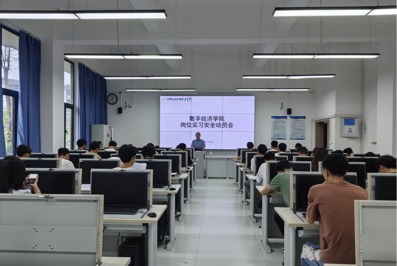 2023年7月3日,数字经济学院岗位实习安全动员会在8A104举行,数字经济学院副院长罗在文、岗位实习指导老师、2021级辅导员及2021级参加岗位实习的学生参会。