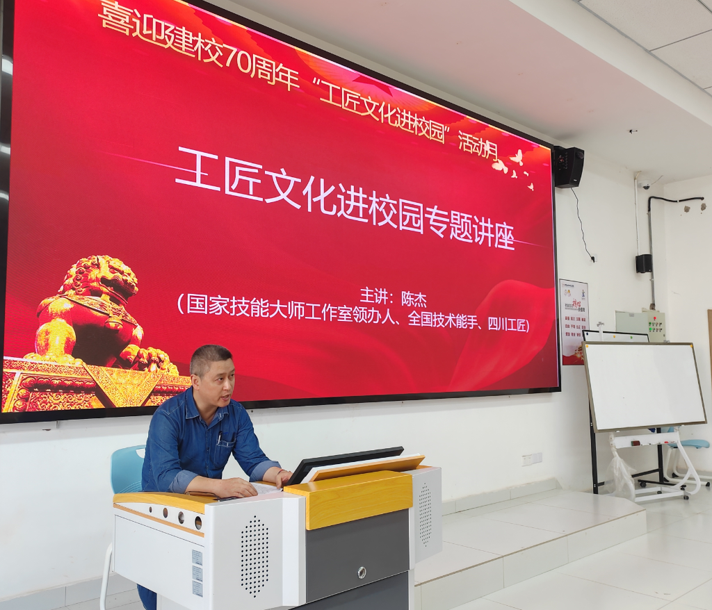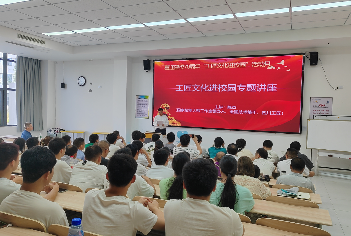 为鼓励新时代青年大力弘扬劳模精神、劳动精神、工匠精神,以更好的精神面貌迎接70周年校庆,2023年5月24日下午,机械工程学院于11A105开展喜迎70周年校庆系列活动之工匠文化进校园专题讲座。特邀国家技能大师工作室领办人、全国技术能手、四川工匠陈杰先生到校演讲,机械工程学院院长任小鸿和师生代表参加活动。