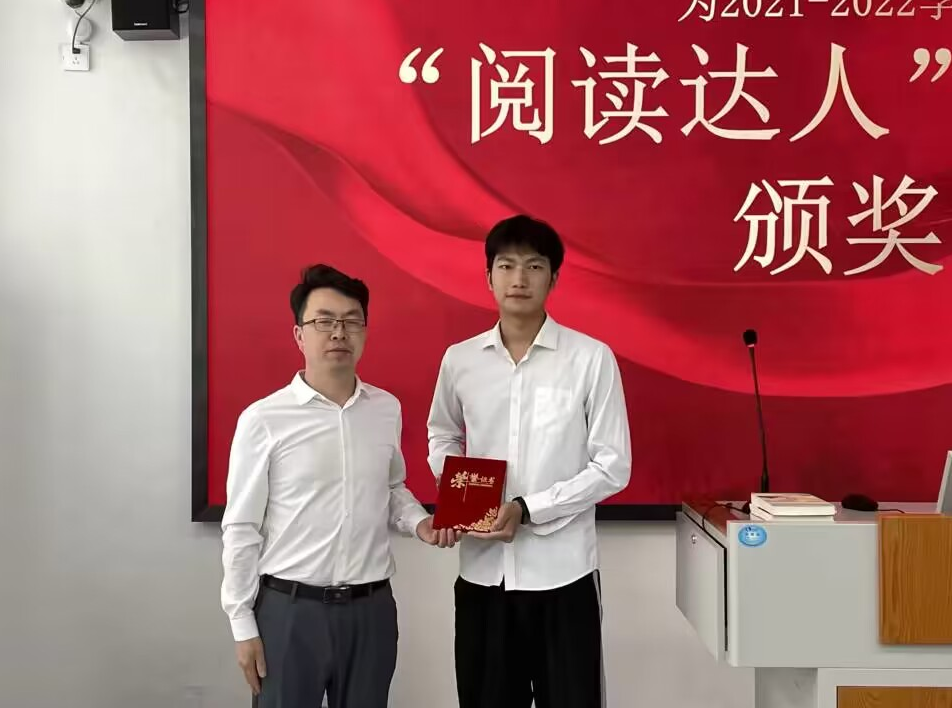 书籍分享环节结束后,唐德兵向2022年阅读量最高、入馆率最频繁的在校学生苟钟文颁发“阅读达人”荣誉称号。