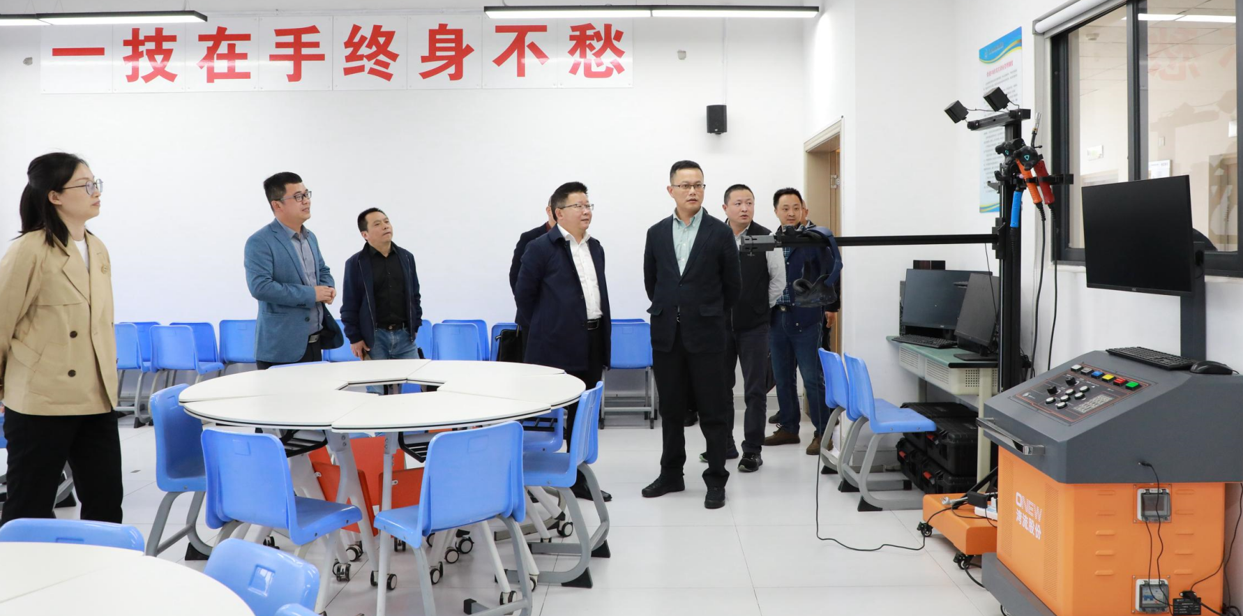 徐林一行先后到博学楼8H焊接和检测实训室、CAD机房、泸州市张勇焊工技能大师工作室、工程实训中心焊接实训车间和车工实训车间实地参观考察。随后在学校综合办公楼221会议室听取申报泸州市特种设备作业人员焊工考试机构事宜汇报并座谈交流。
