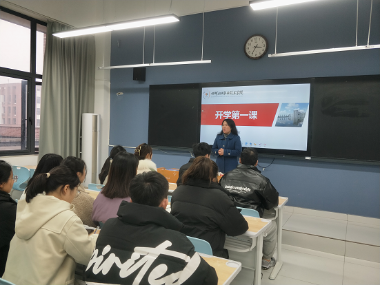 徐丽萍首先感恩为抗击疫情在背后默默奉献和付出的人,让我们今天能健健康康地坐在教室里上课,同时也要珍惜我们来之不易的学习环境和学习机会并向同学们讲解了酒谷湖校区建设以及搬迁新校区的意义,并展望搬迁后对同学们的学习和工作产生的积极影响。