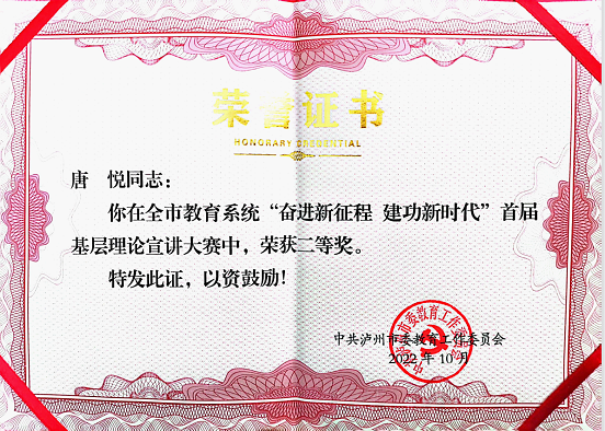 近日,由中共泸州市委教育工作委员会主办的泸州市教育系统“奋进新征程 建功新时代”首届基层理论宣讲大赛顺利举行。经各区县党委教育工委、在泸高校、市属学校推荐,市委宣传部、市委讲师团专家评审组评选产生了大赛一等奖2名,二等奖3名,三等奖12名。学校马克思主义学院教师唐悦荣获大赛“二等奖”。