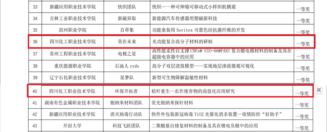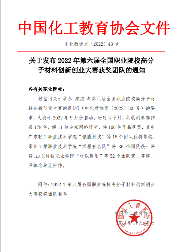 2022年11月30日,由中国化工教育协会主办的2022年第六届全国职业院校高分子材料创新创业大赛成功落下帷幕。应用化工学院王杰、张华知教师指导的“光功能复合高分子材料的研制”和马正禄教师指导的“秸秆重生—农作废弃物的高值化应用研究”双双荣获大赛“一等奖”。