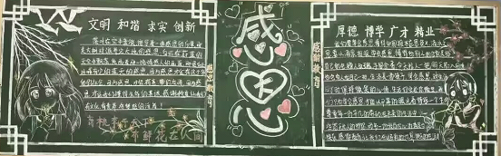 各班级还布置了以“感恩”为主要元素的黑板报,感恩教育对于建设和谐校园、和谐社会的重要意义和作用,也对良好的班风建设起到了积极推动作用。感恩是中华民族的传统美德,是构建社会主义和谐社会的基础,是实现赶超跨越的精神动力。