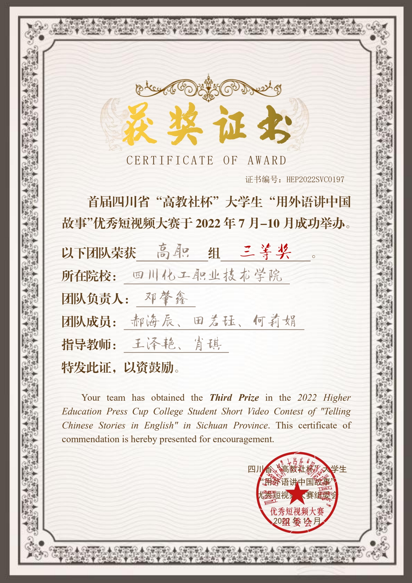 2022年7月——10月,由四川省教育厅主办,成都理工大学承办,四川省普通本科高校外国语言文学类专业教学指导委员会、高等教育出版社协办的首届四川省“高教社杯”大学生“用外语讲中国故事”优秀短视频大赛顺利举行。学校选送的三件参赛作品均荣获“三等奖”。